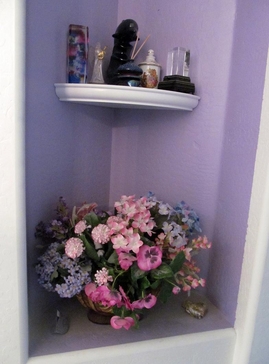 AND by the time of this photo, I had moved Martine's dolphin from the guest bathroom to the shelf above, with angels and other of Martine's keep-sakes.